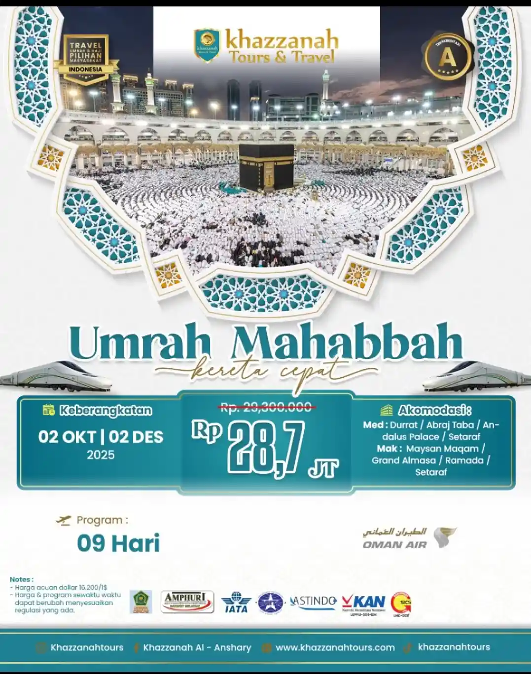 | 28.700.000 | | 2 OKT | 2 DES | | Umroh 9 Hari hotel Bintang kereta cepat OMAN | 9 Hari | Bintang 4, | Ya | OMAN | ||