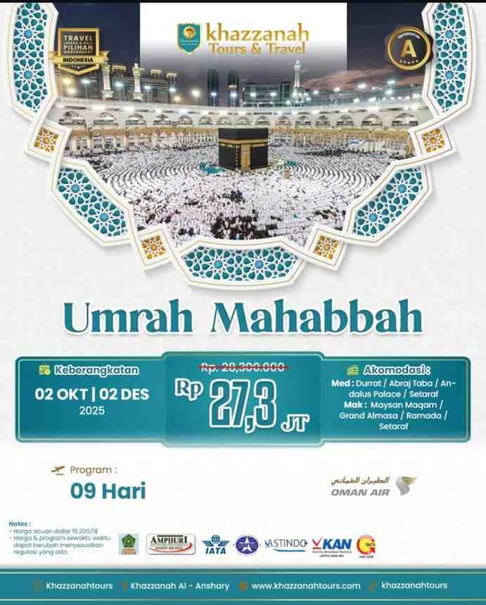 Mendambakan pengalaman umroh penuh ketenangan, sesuai tuntunan Nabi, dengan manajemen perjalanan ahli untuk jemaah Bandung–Jakarta? Khazzanah menyajikan pilihan paket komprehensif: reguler, ekonomis, Ramadhan, Syawal, hingga paket tur religi (Turki, Dubai, Mesir, Aqsa, Eropa). Konfirmasi jadwal & ketersediaan saat ini melalui Telepon 085724841330 atau pesan. Semua pranala berikut mempertahankan struktur URL asli pada domain resmi: umrohbandungkhazzanah.my.id (Khazzanah Bandung) dan umrohbandungkemenag.biz.id (Kemenag Khazzanah Bandung). Simak narasi perjalanan kemudian pilih paket terunggul — Haji Umroh Kemenag.